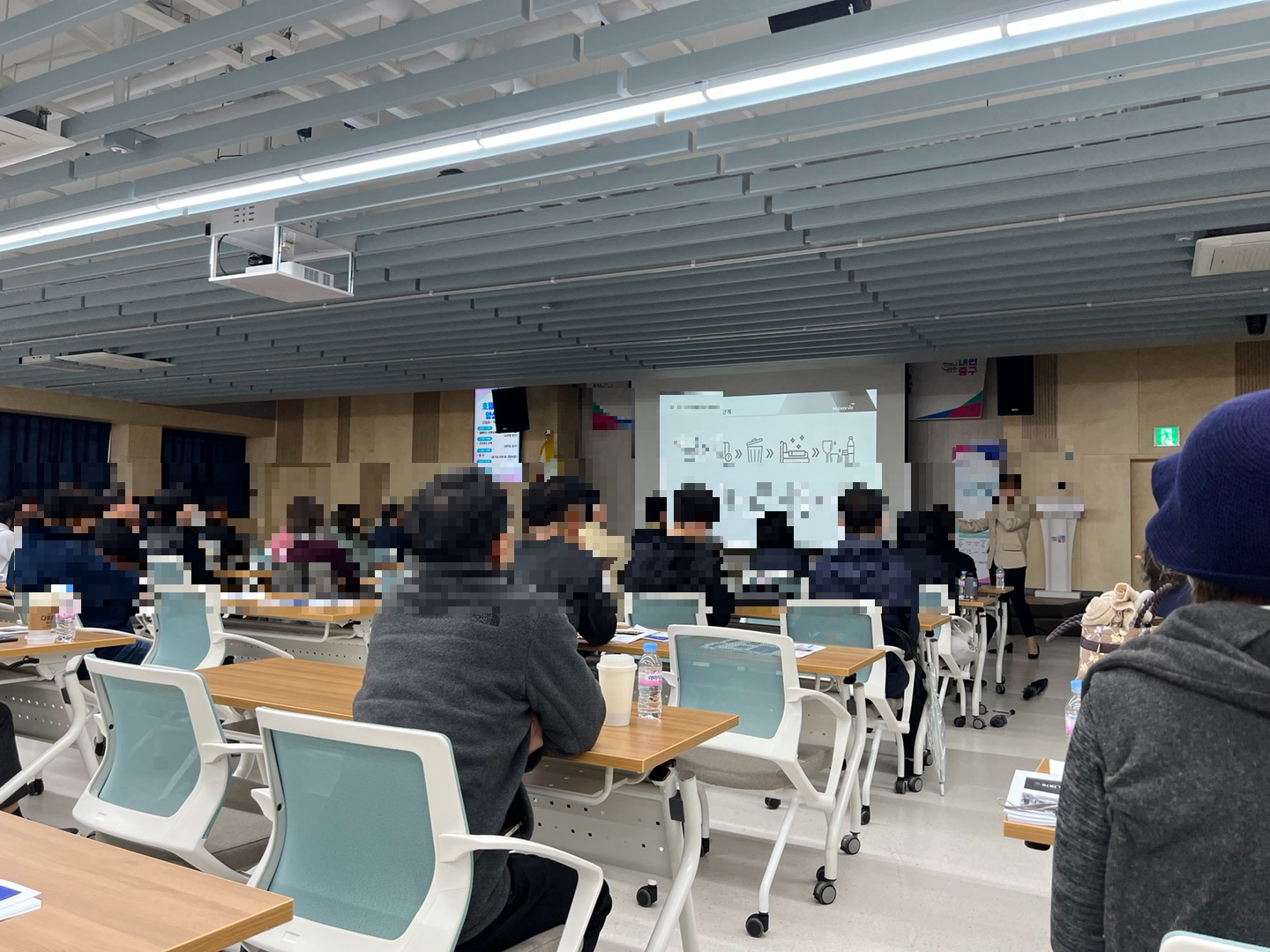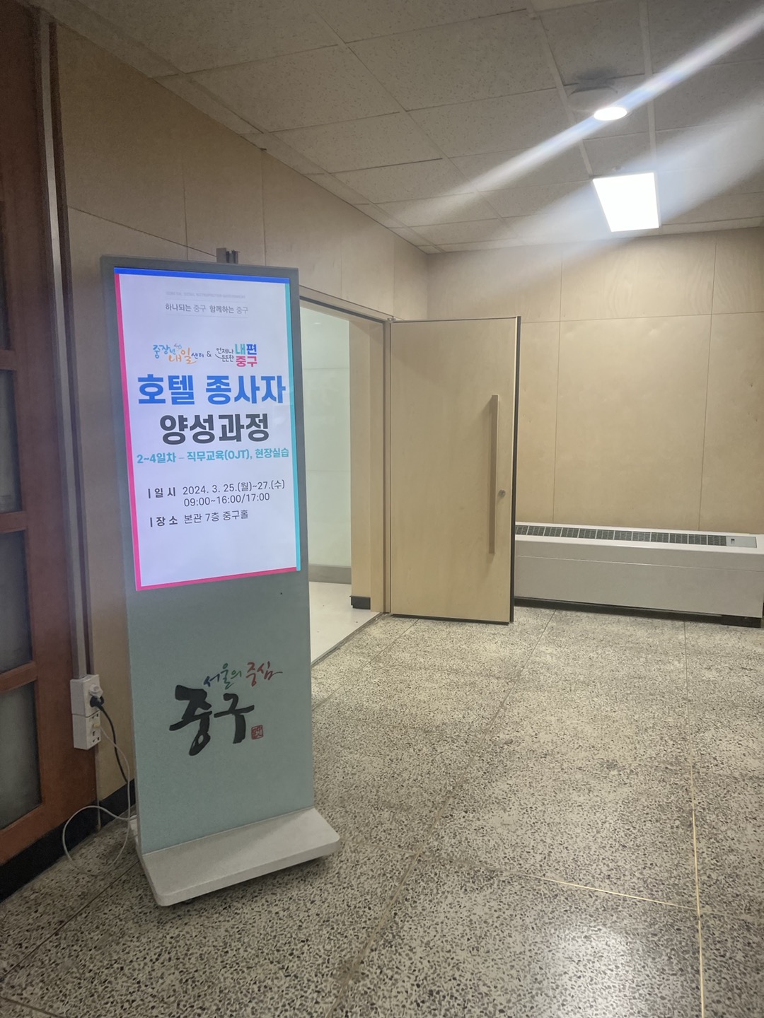 호텔 종사자 양성 과정 2회차를 들으러 왔습니다. 오늘은 중구청 7층 대강당에서 9시부터 교육이 시작 되었습니다. 중구청장 의 인사로 수업이 시작 되었습니다. 중장년의 취업을 위해서 신경써